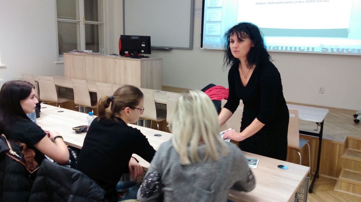 Vedoucí dobrovolnického centra ADRA Ing. Dagmar Hoferková přijala pozvání Fakulty sociální práce Ostravské univerzity. V předmětech Sociální práce se seniory a Senioři ve společnosti představila téma dobrovolnictví. Studenti získali informace o principech dobrovolnictví, diskutovali o mezigeneračních projektech, ale také o dobrovolnictví samotných seniorů.