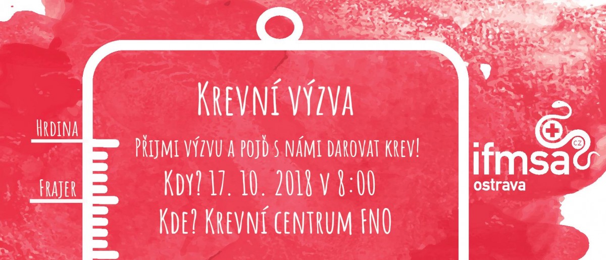 Neurochirurgie, komplikované porody, novorozenecká žloutenka, transplantace – tam všude se darované krve využívá a pořád je jí málo. V říjnu budete mít jedinečnou příležitost to změnit. Ostravská pobočka IFMSA vyhlašuje Krevní výzvu a oznamuje: „Že se ve vás krve nedořeže? To bychom se na to podívali!“