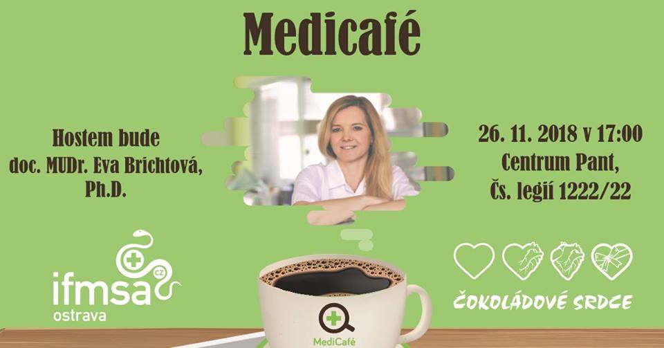 I v listopadu se můžete těšit na další besedu z cyklu Medicafé, která opět proběhne v režii členů organizace IFMSA CZ Ostrava a projektu Čokoládové srdce. Hostem bude jediná česká docentka v oblasti neurochirurgie Eva Brichtová, která vás seznámí se svou profesní dráhou i taji neurochirurgie.