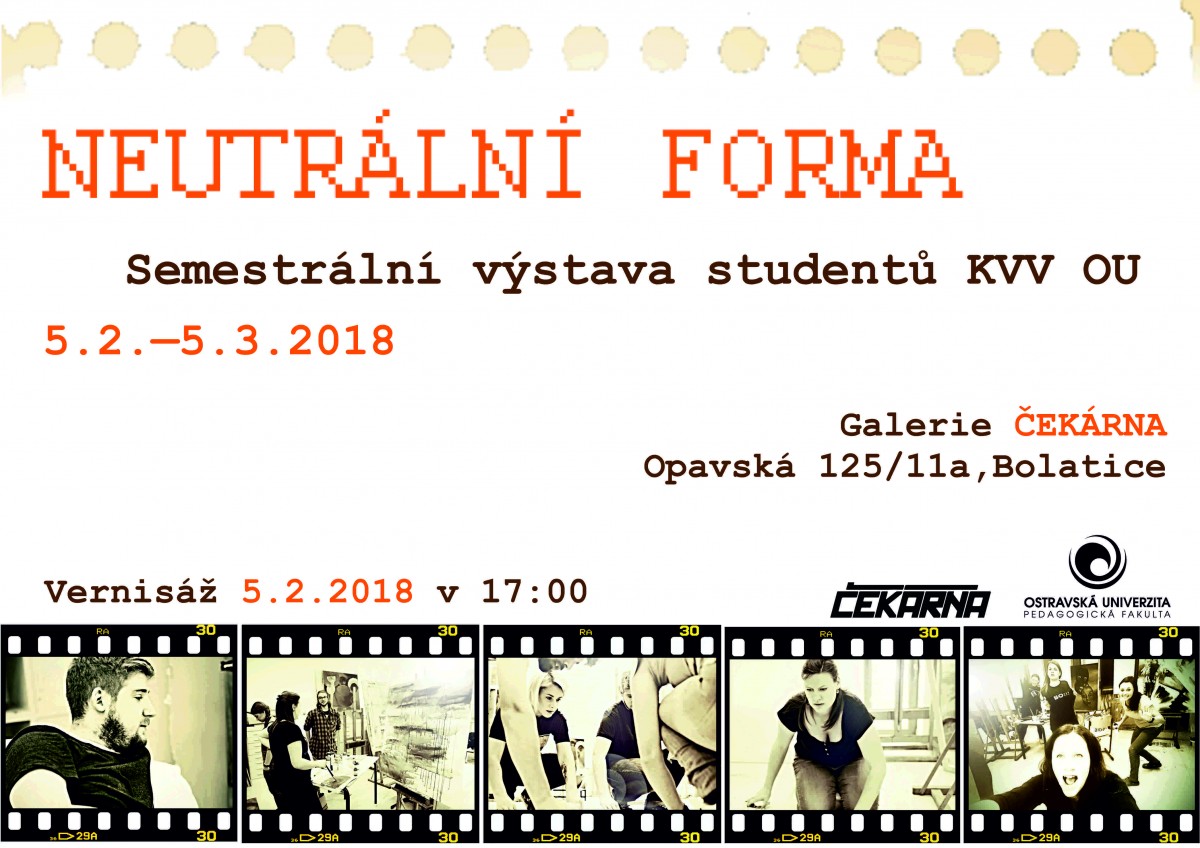 Výstava Neutrální forma byla zahájena vernisáží 5. února a potrvá do 5. března 2018. Stojí za to vidět, že o schopné a aktivní studenty nemá ani Pedagogická fakulta nouzi. Tak na viděnou v Galerii ČEKÁRNA v Bolaticích u Opavy, kterou můžete oslovit třeba s realizací výstavy i VY!