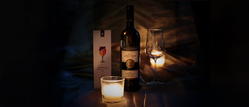 Ryzlink vlašský, pozdní sběr, ročník 2015, vinařství Mikrosvín Mikulov, Březí, viniční trať Liščí vrch. To je v pořadí třetí Univerzitní víno Ostravské univerzity, které 30. listopadu 2017 pokřtil zpěvák a také vynikající student katedry biologie a ekologie Dan Bárta.
