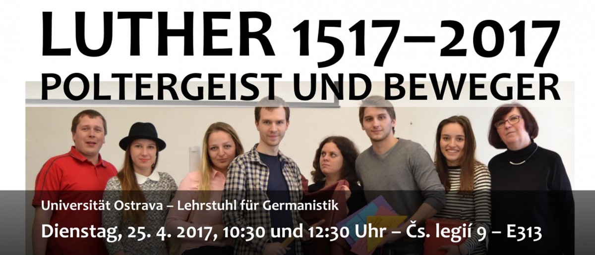 Před 500 lety přibil Martin Luther na bránu Zámeckého kostela ve Wittenbergu 95 tezí proti odpustkům. Divadelní hru k výročí události, jež vedla k rozštěpení katolické církve a ke vzniku luterských, evangelických a dalších protestantských církví, představí studenti katedry germanistiky v úterý 25. dubna v 10:30 a ve 12:30 hodin v učebně E313. Hra má název Martin Luther 1517–2017. Poltergeist und Beweger (Martin Luther 1517–2017. Buřič a hybatel) a zachycuje nejdramatičtější okamžiky Lutherova života.