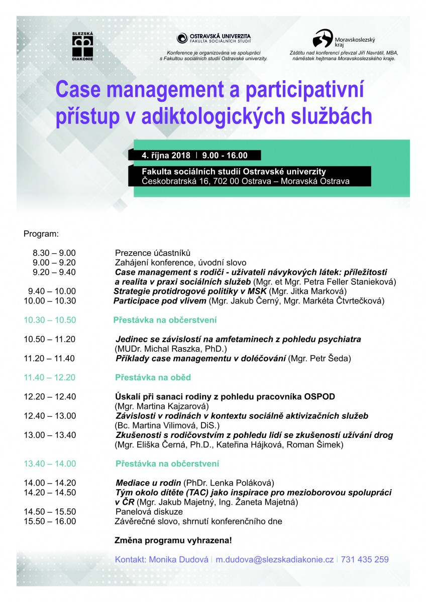 Dne 4.10.2018 proběhne v aule OU odborná konference pod názvem “Case management a participativní přístup v adiktologických službách”, kterou pořádá Slezská diakonie ve spolupráci s Fakultou sociálních studií OU.