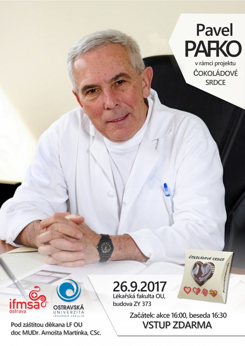 Profesor Pafko provedl se svým týmem jako první u nás úspěšnou transplantaci plic. Známý je rovněž díky operativnímu odstranění plicního nádoru prezidentu Václavu Havlovi v roce 1996. Přijďte si užít obohacující odpoledne v příjemném prostředí Lékařské fakulty, dopřejte si skvělou čokoládu a udělejte něco pro dobrou věc v rámci jedinečného studentského projektu. Akce se koná v úterý 26. 9. v posluchárně Lékařské fakulty Ostravské univerzity od 16 hodin (ZY 373).
