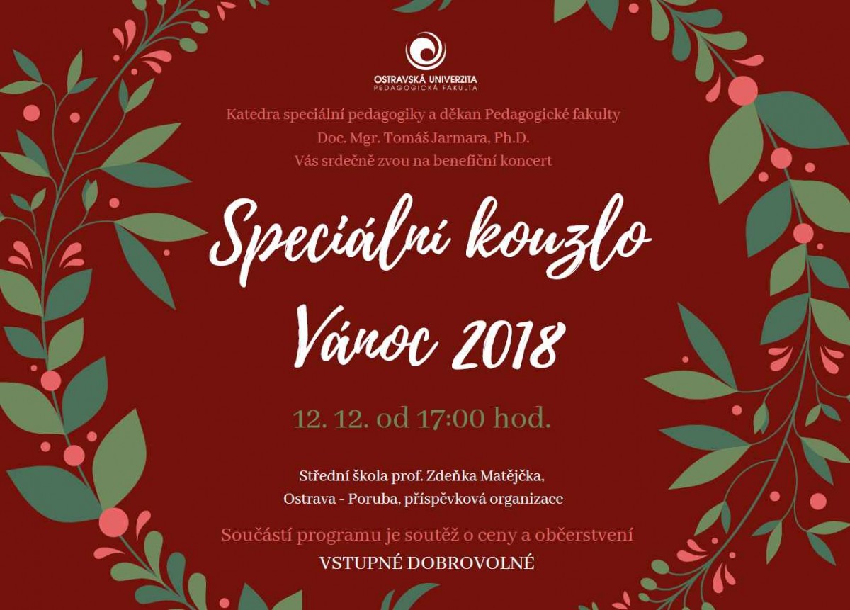 Děkan Pedagogické fakulty Ostravské univerzity doc. Mgr. Tomáš Jarmara, Ph.D., Katedra speciální pedagogiky a studenti třetího roku studia bakalářského oboru Speciální pedagogika si všechny dovolují pozvat na 5. ročník benefičního koncertu Speciální kouzlo Vánoc 2018.