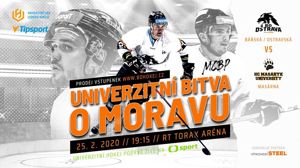 Nyní se v Ostravě schyluje k dalšímu milníku v univerzitním hokeji. Na porubském zimním stadionu se chystá univerzitní bitva o Moravu. Báňská a Ostravská tentokrát spojí své sílyproti brněnské masarykově univerzitě. Pořiďte si vstupenky na ledový souboj 25. února 2020 od 19.15 hodin v porubské RT Torax aréně. Podrobnosti o akci najdete na facebookové události, pak si rovnou kupte vstupenky.
