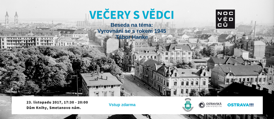 První z nich se bude konat již 23. listopadu 2017 od 17.30 hod v Domě knihy na Smetanově náměstí v centru Ostravy. Tématem tohoto Večera s vědci bude vyrovnávání se s rokem 1945, hosté pohovoří o osudech ostravských Němců, poválečných událostech a připomenou také oběti v Ostravě, například v táboře Hanke.