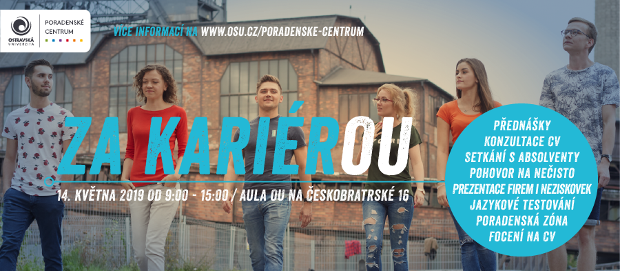 Milé studentky a studenti, svou barvu na univerzitě jste si už vybrali, teď je načase přibarvit i vaši budoucí kariéru. Náš hvězdný tým z Poradenského centra pro vás pilně připravuje první ročník zbrusu nového kariérního festivalu Za KariérOU, který ovládne prostory auly Ostravské univerzity již v úterý 14. května od 9.00 do 15.00. Vítáni jsou všichni studenti, absolventi i zájemci z široké veřejnosti.