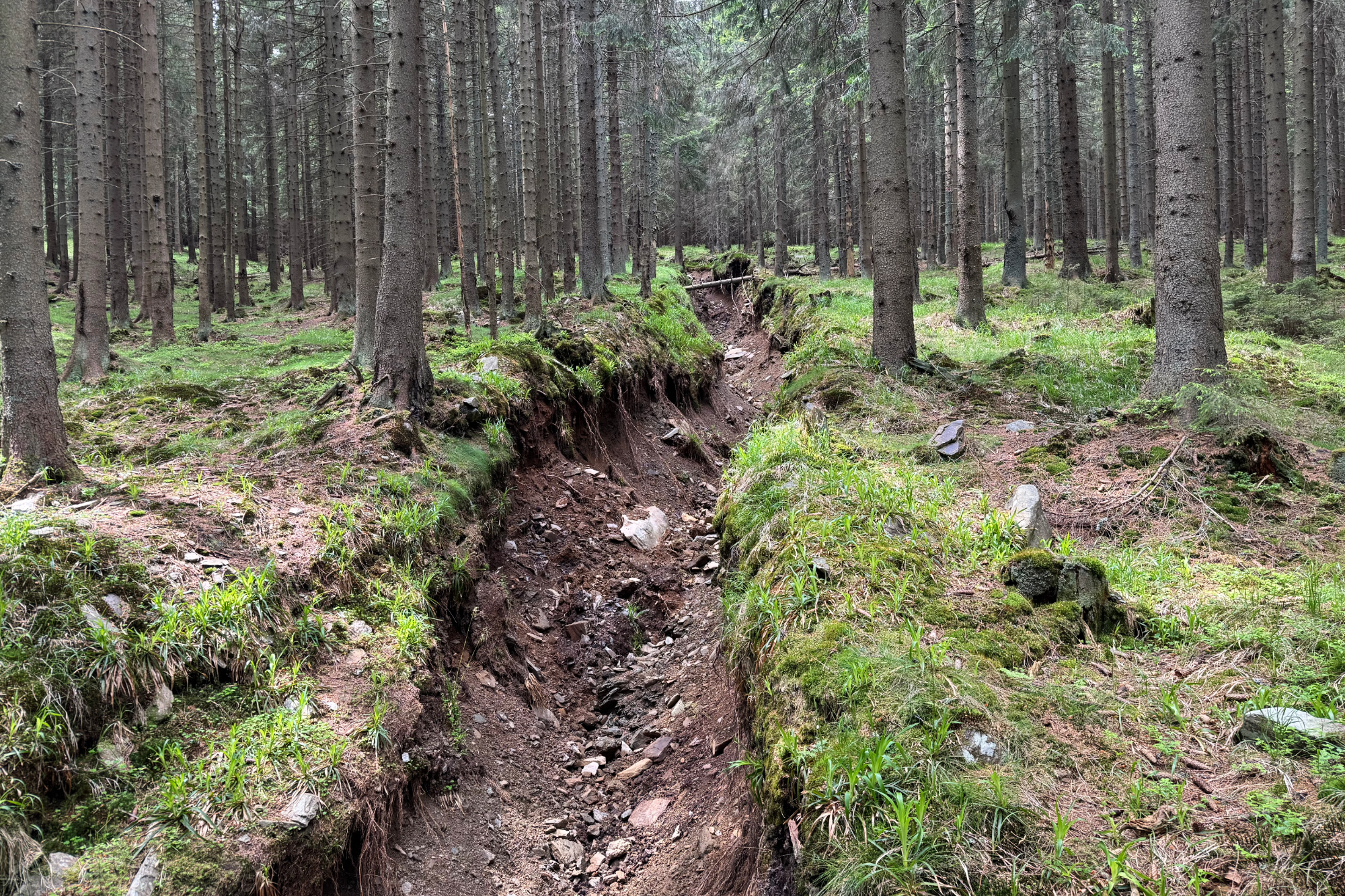 Extrémní projevy eroze po povodních 2024 v Hrubém Jeseníku. Negativní role utužených půd na lesních cestách
