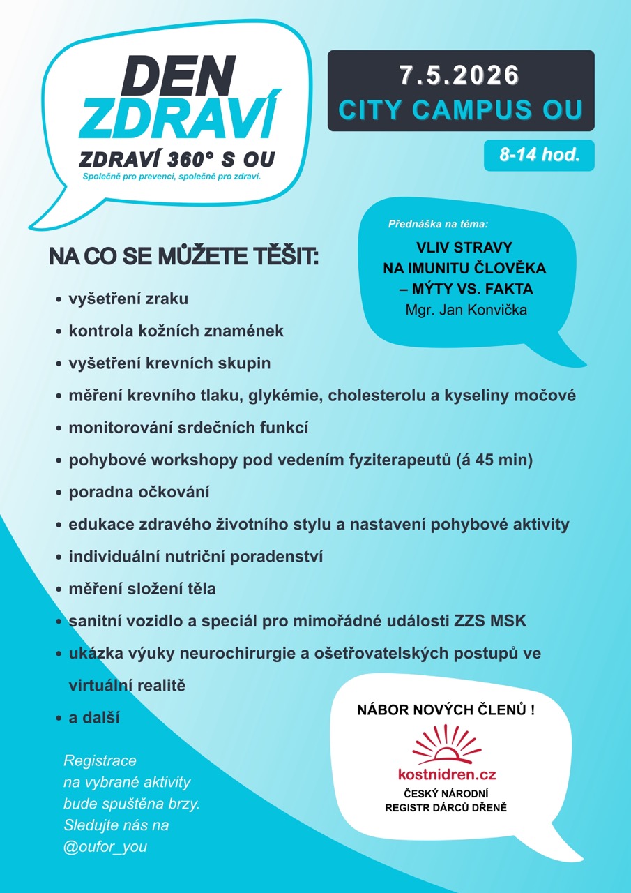 Den zdraví na Ostravské univerzitě není jen souborem stanovišť a měření. Je to prostor, kde se potkává věda, praxe i každodenní život. Prostor, kde si můžete v klidu zodpovědět otázku: Jak na tom vlastně jsem – a co pro sebe můžu udělat dnes?