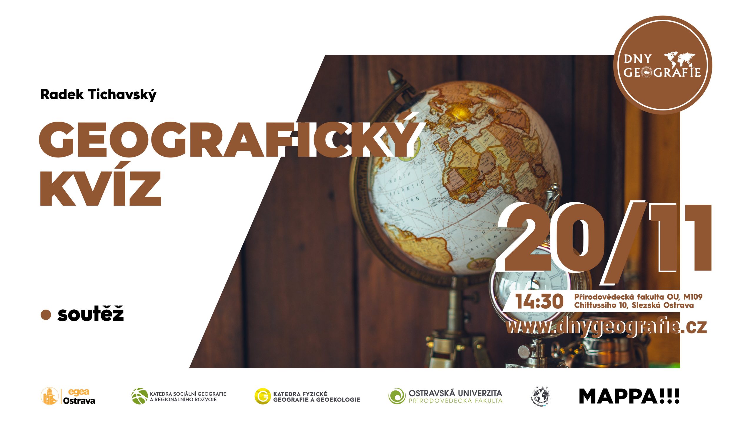 Máte rádi kvízy? Pak přijďte 20. listopadu na Hladnov (Chittussiho 10) zkusit ten geografický. Čekají na vás výzvy spjaté s oborem i nejrůznější zajímavosti. Stačí jen vytvořit tým od 2 do 6 soutěžících a můžete srovnávat vaše vědomosti a podmanit si Přírodovědeckou fakultu. Registrovat se můžete zde.