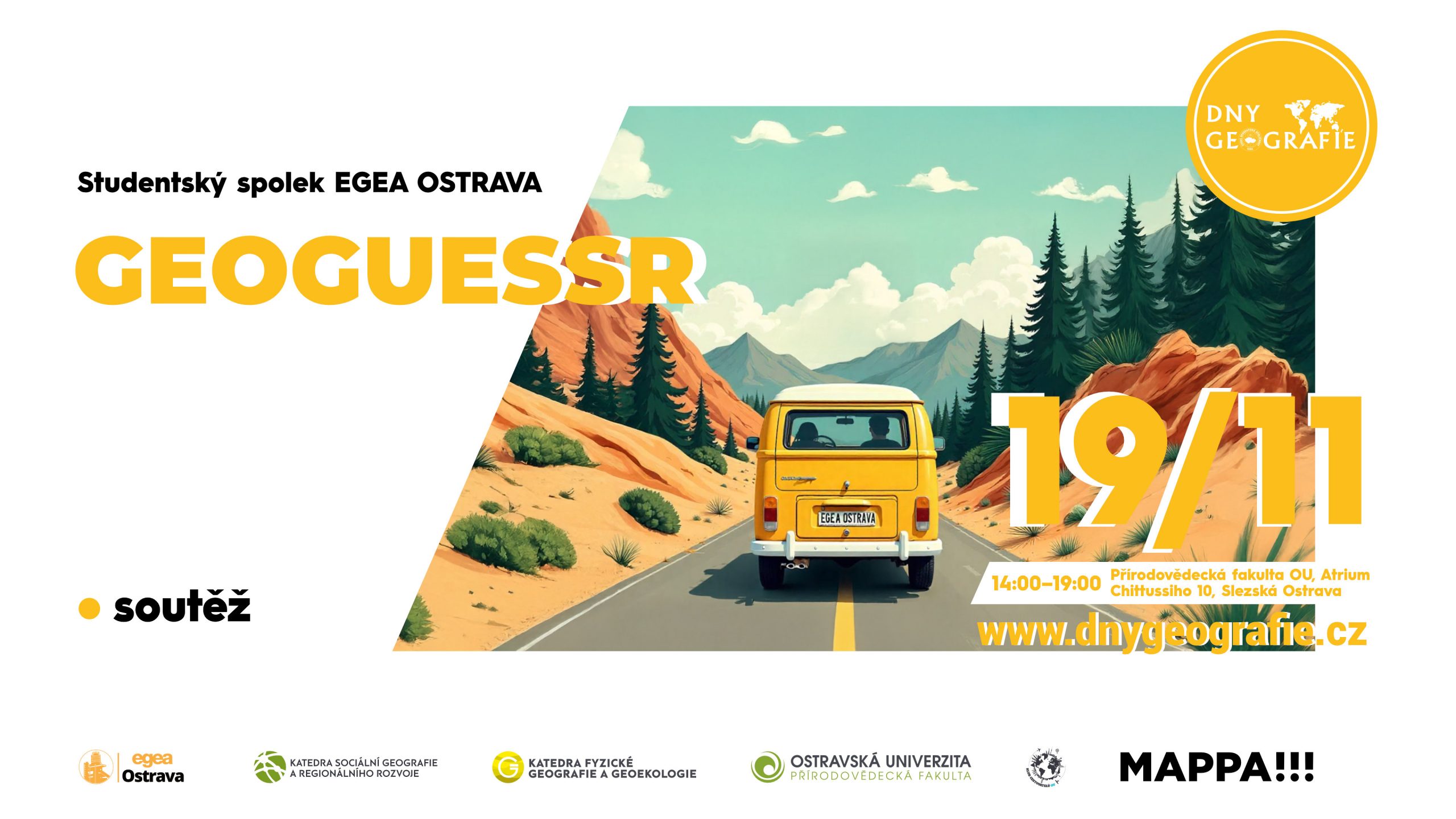 Vyznáte se ve světě? Poznáte známá místa Česka, Evropy, Ostravy nebo dovedete odlišit jednotlivé státy od sebe? Pak jste na správném místě! Sestavte dvojčlenný až trojčlenný tým, přihlaste se zde do Geoguessru a přijďte si zasoutěžit se studentským spolkem Egea a rozhodnout, kdo se vyzná nejvíce! Že neznáte Geoguessr? To vůbec nevadí, protože soutěž není jen pro ostřílené geografy a může v ní dominovat třeba i naprostý laik. Čeká na vás hra, která využívá snímkování Google Street View. Program vás tak umístí na náhodné místo ve světě a vašim úkolem je zjistit, kde se nacházíte! S sebou si přineste notebook, tým a dobrou náladu.