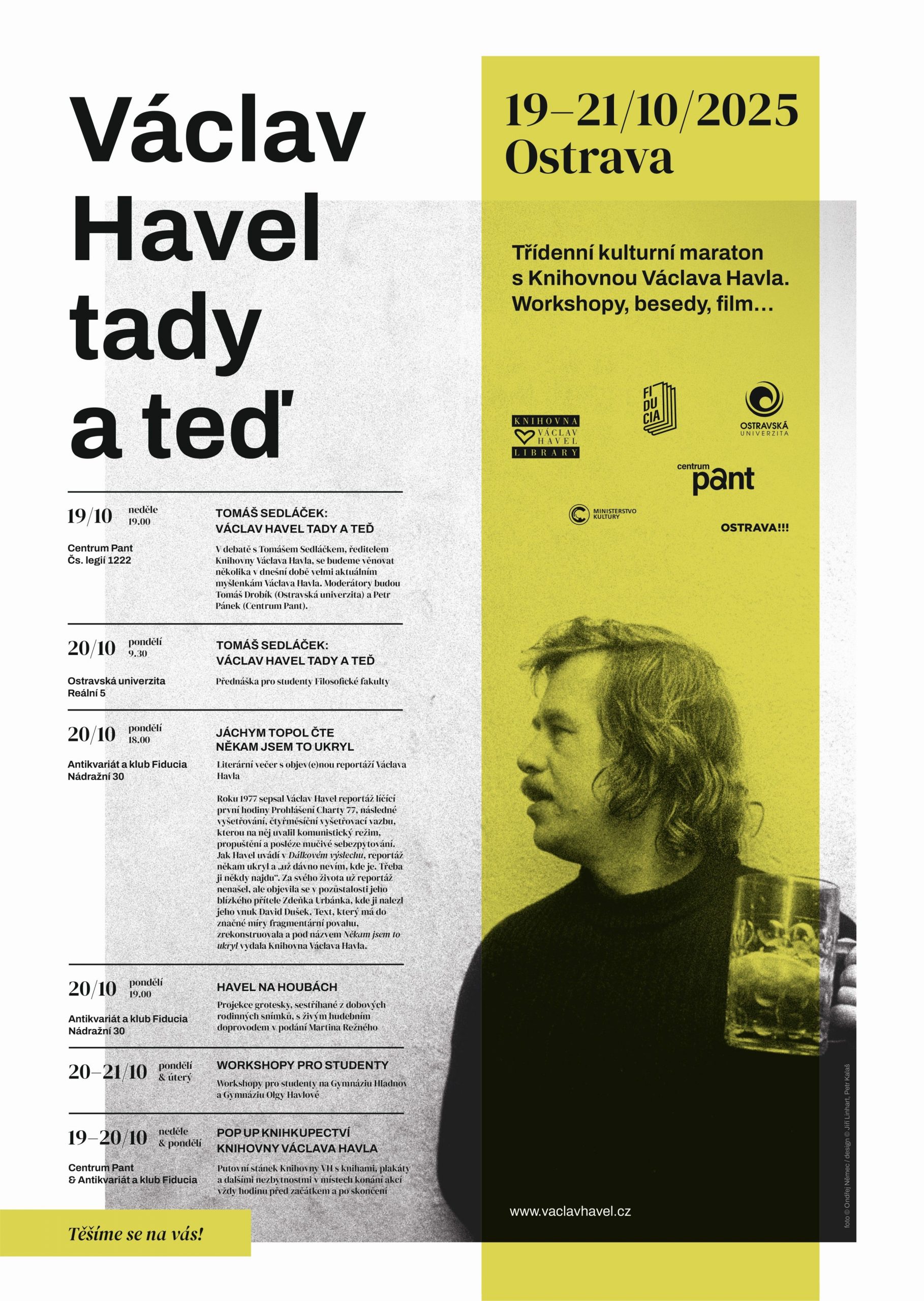 Po předchozích zastávkách v řadě českých měst se Knihovna Václava Havla vrací do Ostravy, kde se projekt uskutečnil již dvakrát – v květnu 2016 a v říjnu 2018. Letošní ostravské vydání nabídne třídenní kulturní maraton Václav Havel tady a teď, který se bude konat 19.–21. října. Ostrava se tak na tři dny promění v prostor živého dialogu o myšlenkách, odkazu a aktuálnosti díla Václava Havla. Program přinese debaty, čtení, film, workshopy i netradiční setkání, která propojí minulost s přítomností a nabídnou inspiraci pro dnešní dobu.