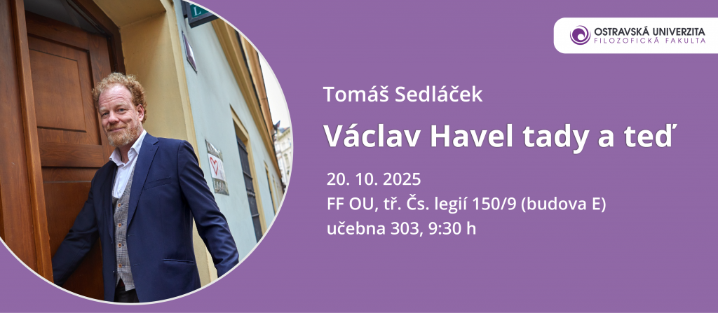 Součástí tohoto kulturního maratonu bude i přednáška ekonoma a filozofa Tomáše Sedláčka na půdě naší Filozofické fakulty Ostravské univerzity. Konat se bude v pondělí 20. října od 9:30 v budova E Filozofické fakulty OU, konkrétně v učebně E303.