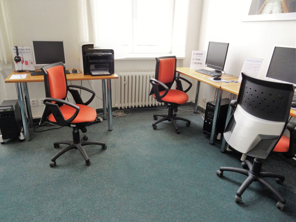 Studovna poskytuje klidné zázemí pro individuální práci a je vybavena počítači, skenerem i tiskárnou. Zapomněli jste si sluchátka nebo nabíječku na mobil? I na to pamatujeme, stačí požádat pracovnici studovny o zapůjčení.
