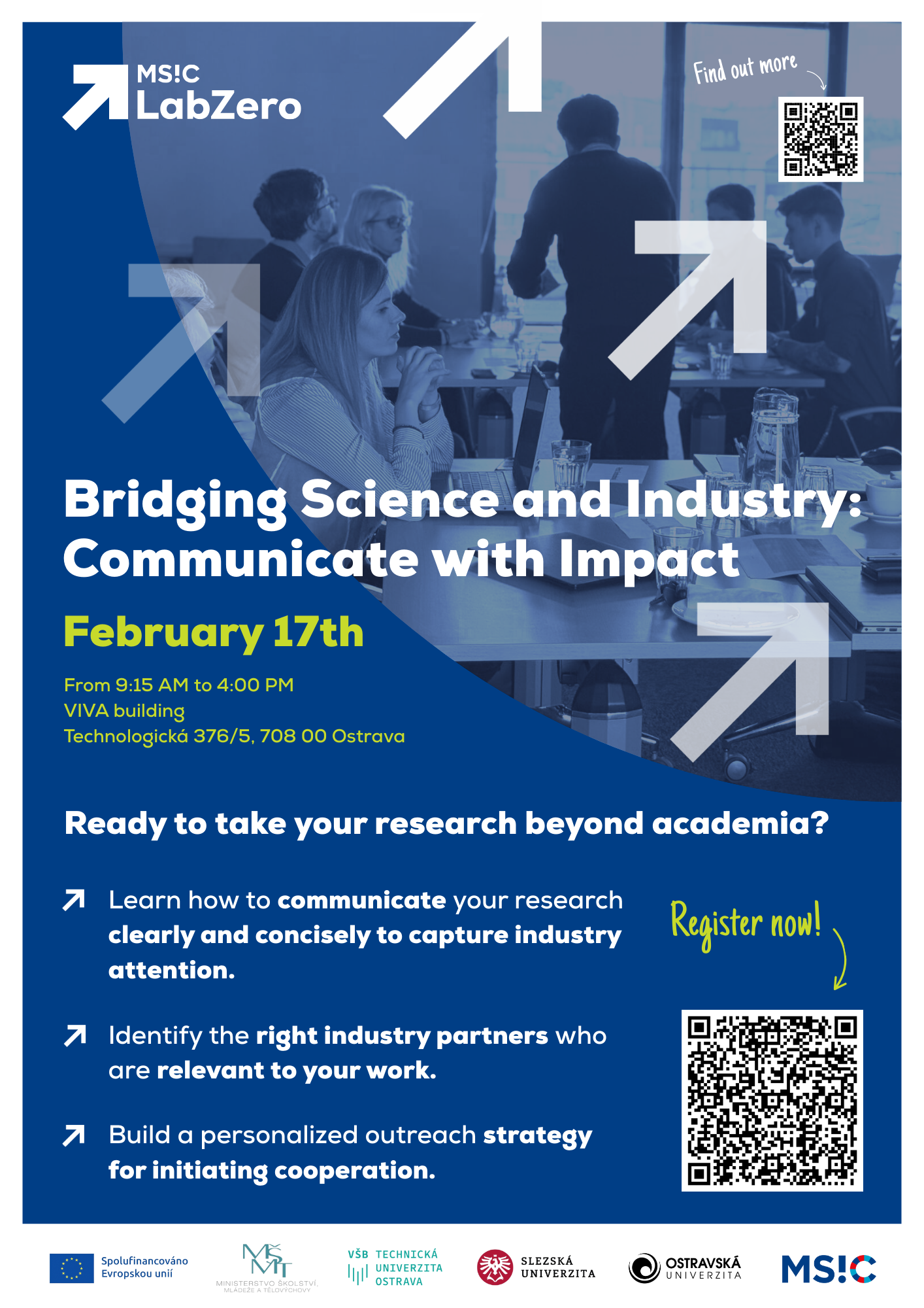„Účastníci se na workshopu naučí, jak efektivně identifikovat a oslovit průmyslové partnery v různých situacích – od vyjednávání smluvních výzkumných dohod až po hledání příležitostí ke zhodnocení jejich práce mimo akademickou sféru. Dozví se, jak stručně a jasně vysvětlit svůj výzkum tak, aby rychle zaujali potenciální partnery. Společně si určí konkrétní relevantní zástupce z průmyslu a připraví personalizované strategie, jak je oslovit,“ uvedla za organizátory Pavlína Baranová z MSIC.