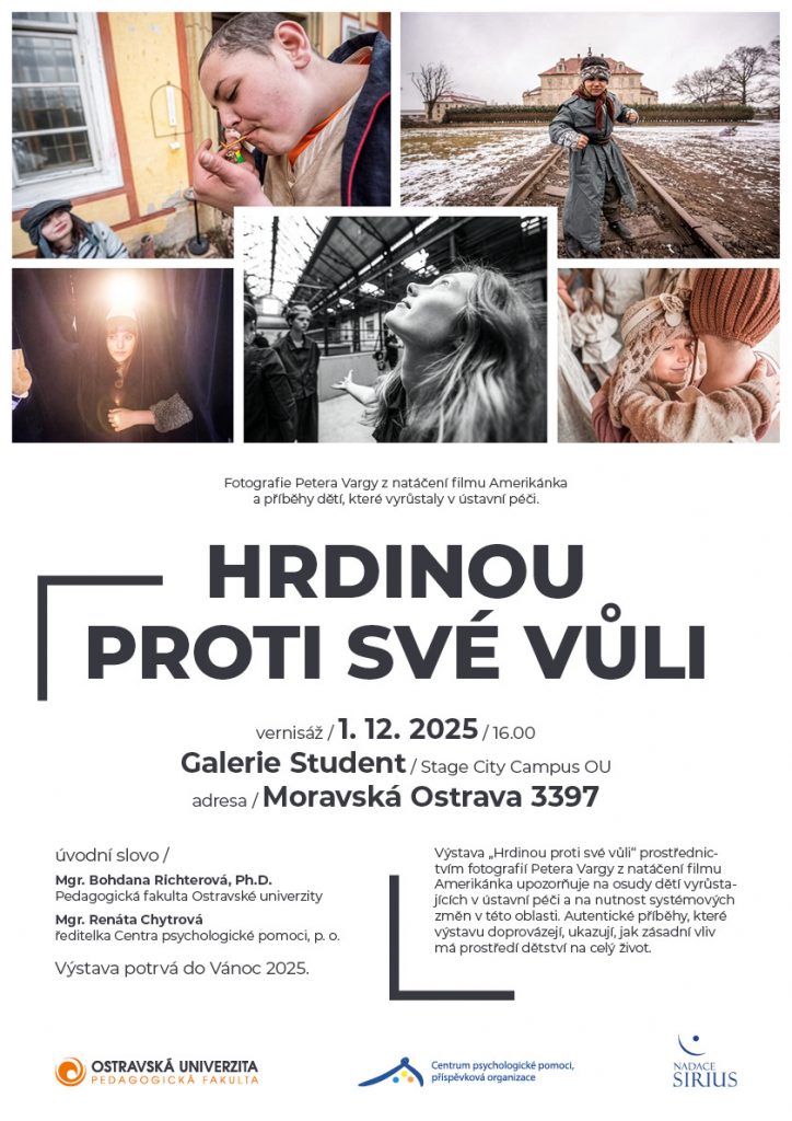 Pedagogická fakulta Ostravské univerzity zve veřejnost na vernisáž výstavy Hrdinou proti své vůli, která se uskuteční 1. prosince 2025 v 16.00 v Galerii Student na Stage City Campus OU (Moravská Ostrava 3397). Úvodní slovo pronese Mgr. Bohdana Richterová, Ph.D. z Pedagogické fakulty OU a Mgr. Renáta Chytrová, ředitelka Centra psychologické pomoci.